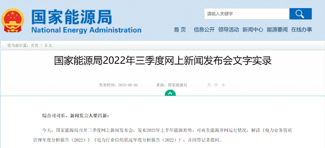 近日,國家能源局召開三季度網(wǎng)上新聞發(fā)布會,發(fā)布2022年上半年能源形勢、可再生能源并網(wǎng)運(yùn)行情況,并回答記者提問。